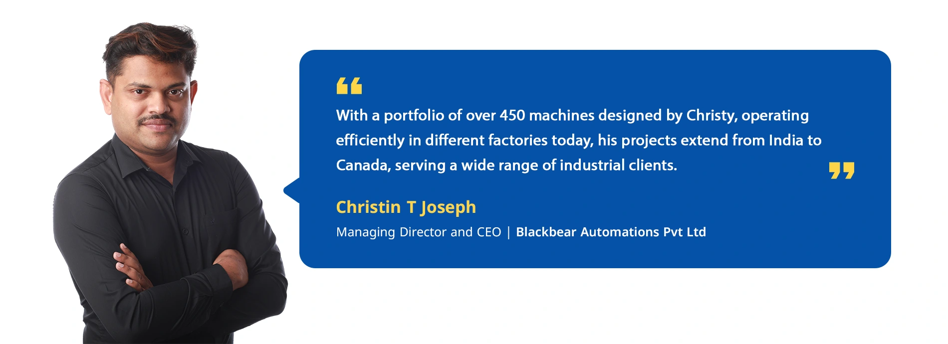 Designing such machines brought a significant transformation to Christy’s career. He realised precision-driven research and development in customised machinery held strong market value. To cater to the growing demand for advanced industrial machines, he founded BlackBear Automation Pvt Ltd in 2016. From there on, Christy started receiving numerous inquiries from the industrial sector.